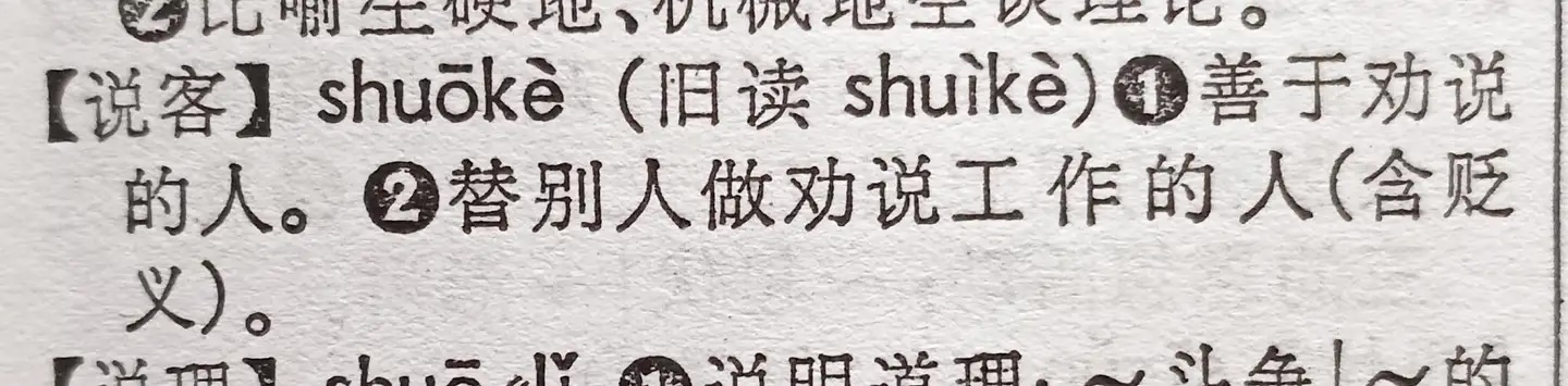 所以,shuì客之读音无论从同义同音原则,还是从词典考证都应该读shuì。但是,1978年商务印书馆初版《现代汉语词典》,却把读音改为shuo,但是游说的发音仍为shuì。或许是因为说客常用,而游说仅常见于文言文,文盲们用不到,所以按照“从俗从众”的原则,“游说shuì”就逃过一劫。