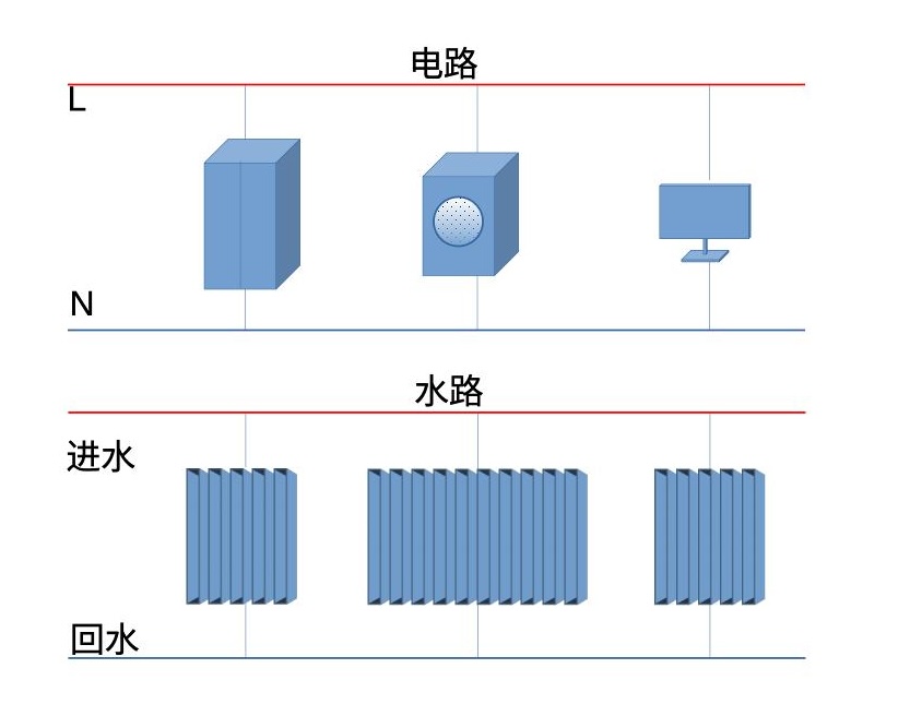 还记得最早学习电路的时候,一般把电路类比成水路。电流类比为水流,电压类比水压。既然电路可以类比水路,那么电路和水路基本原理应该是近似的。然而笔者遇到一个问题,就是并联的暖气片为什么有的热有的不热呢?电路可以类比水路,反过来水路也可以类比电路,暖气片并联,相同的暖气片应该一样热才对 ,而实际结果是并联的暖气片第一个最热,越往后越凉。是类比有问题吗?问题出在哪了?