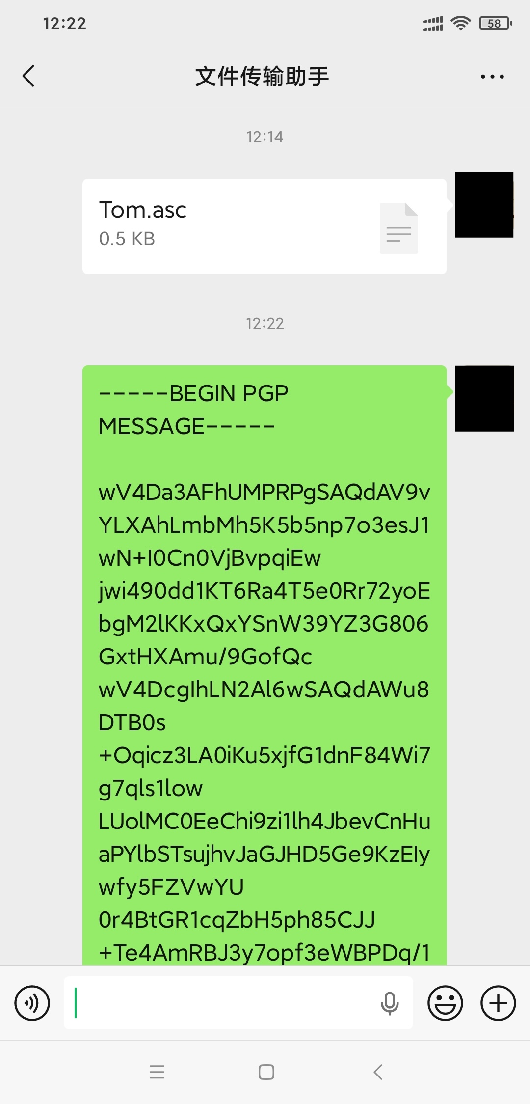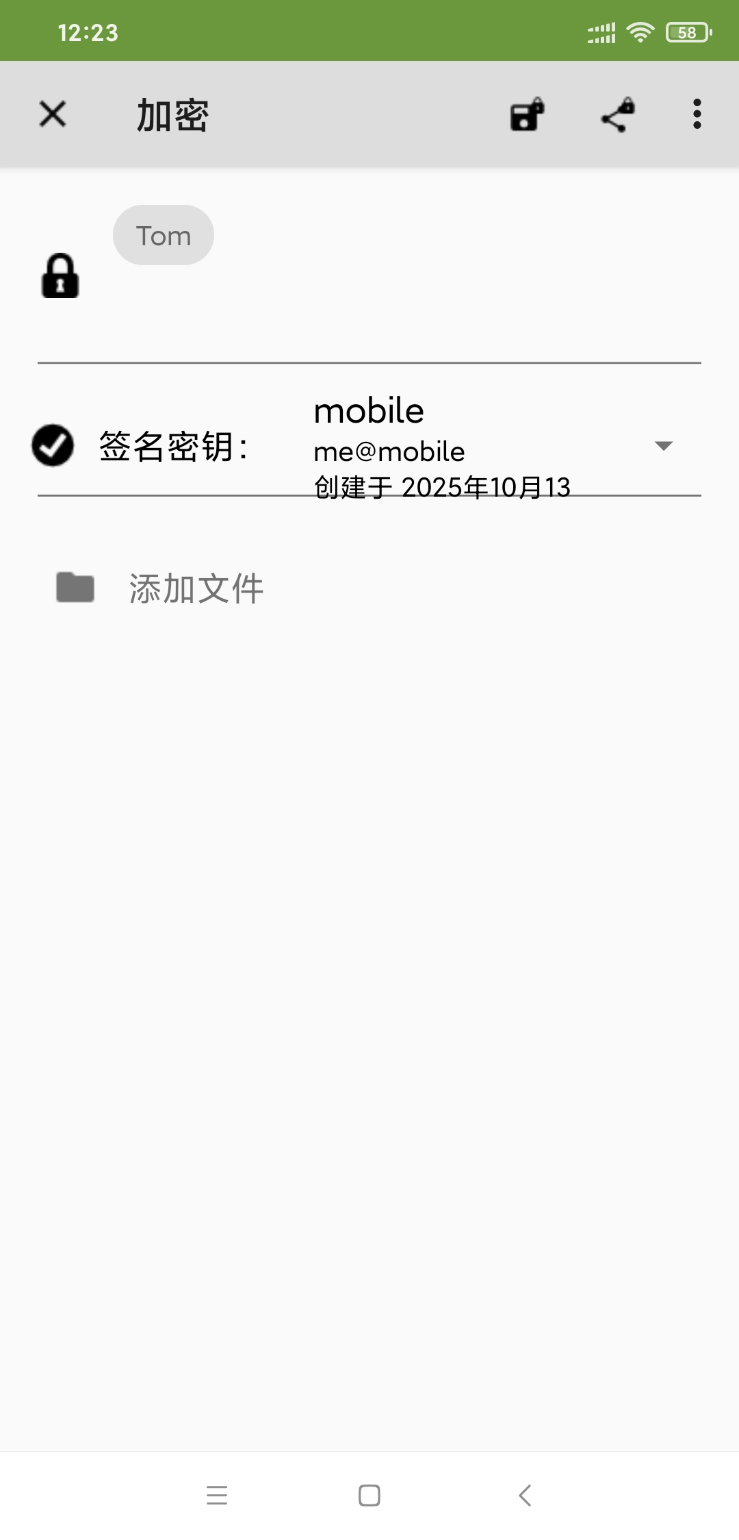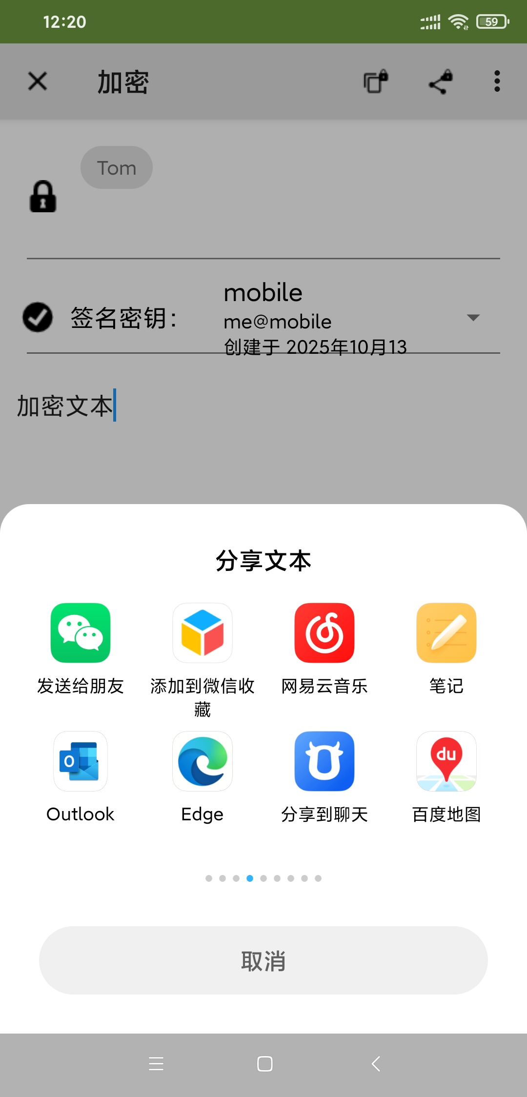 通信双方分别创建密钥后,需要交换公钥,才能实现点到点加密。 点击上面的分享图标,可以通过微信、邮件等发送给好友,如下图,会发送一个asc扩展名的文件