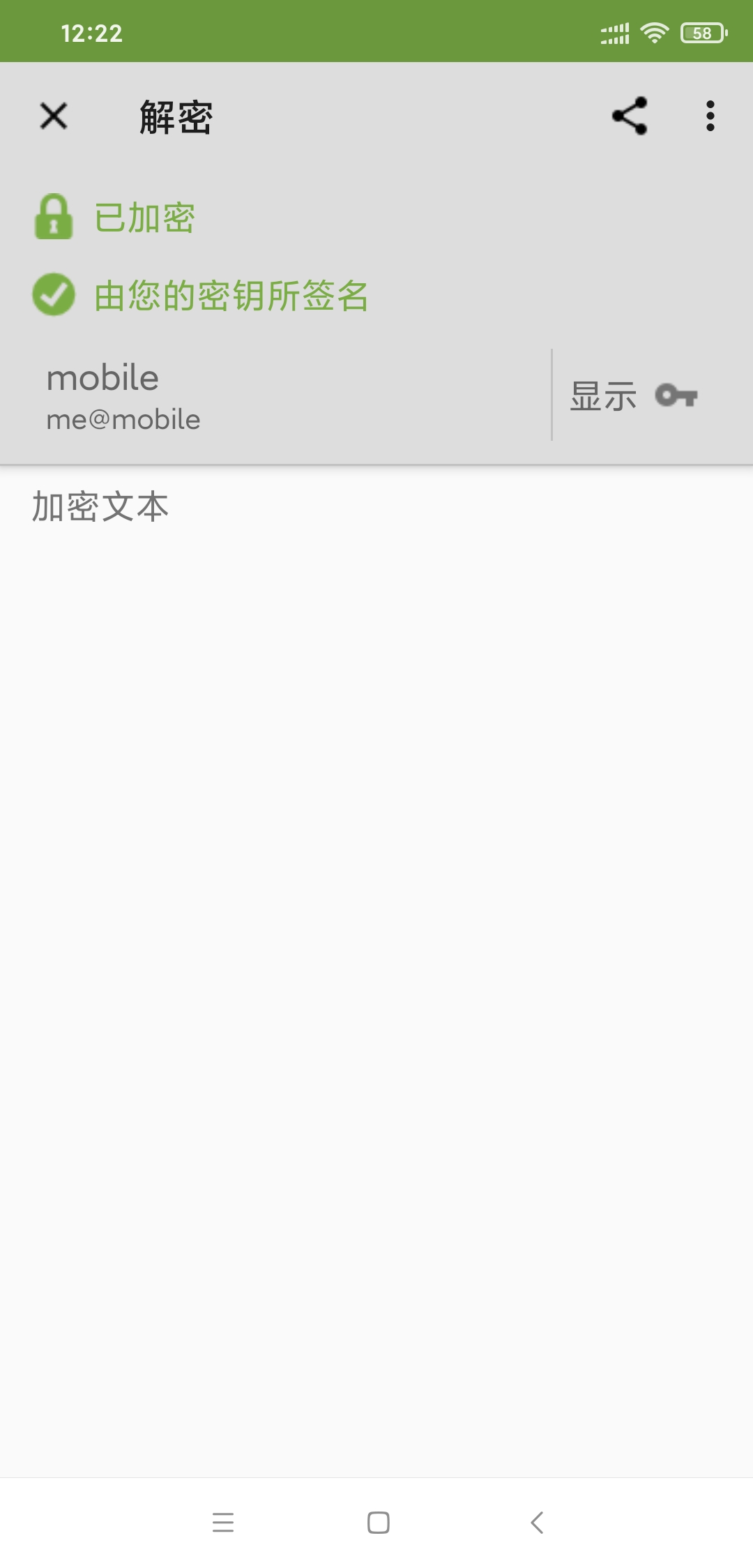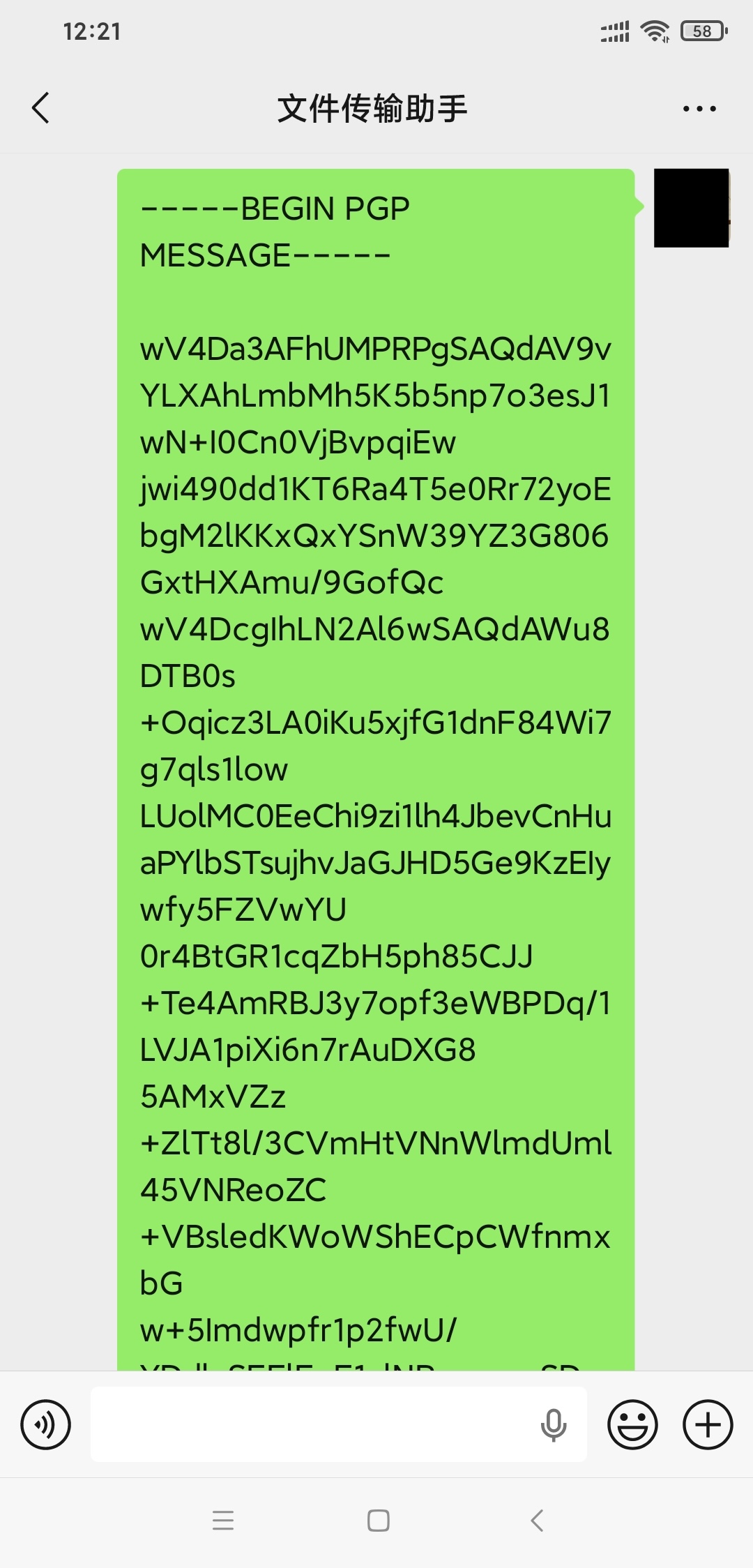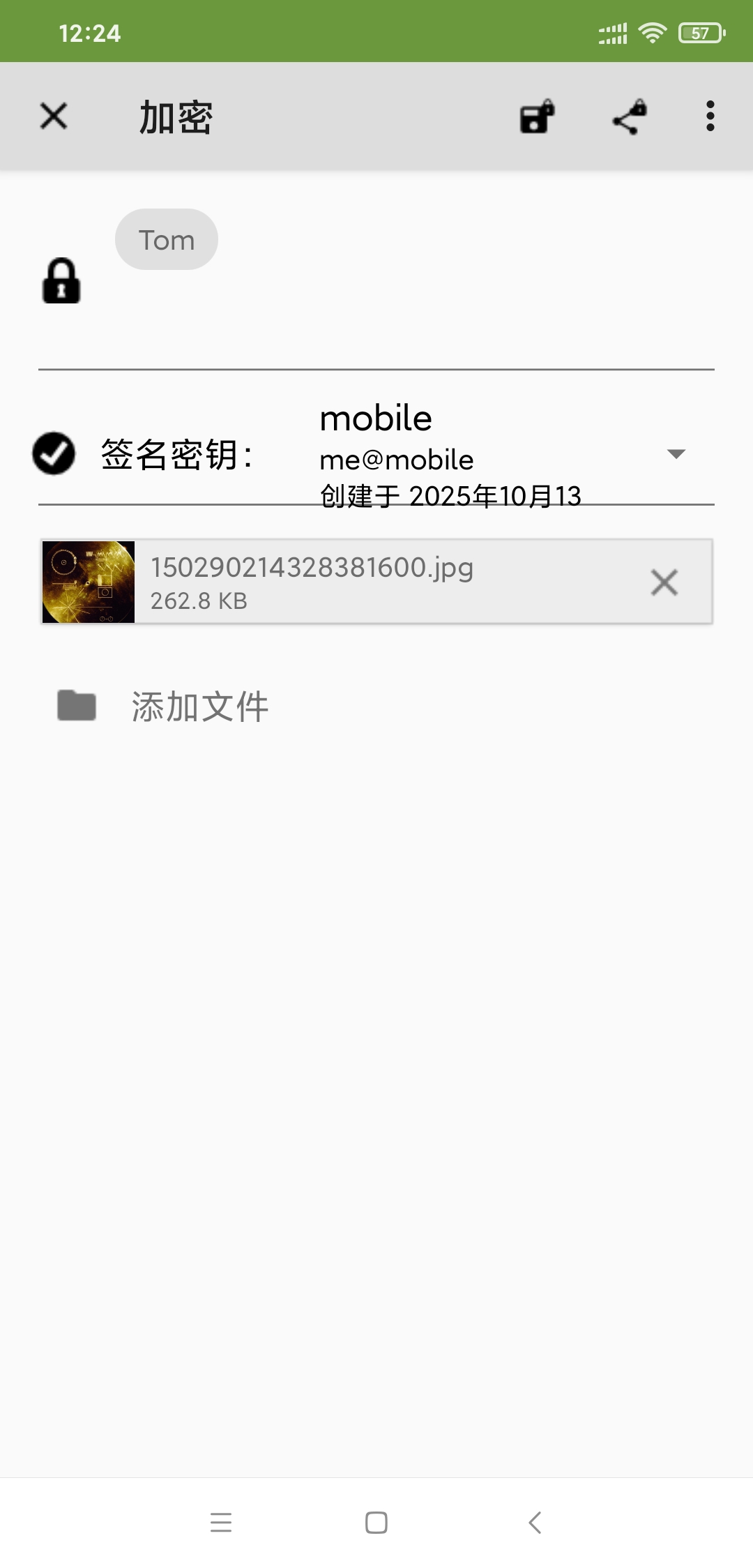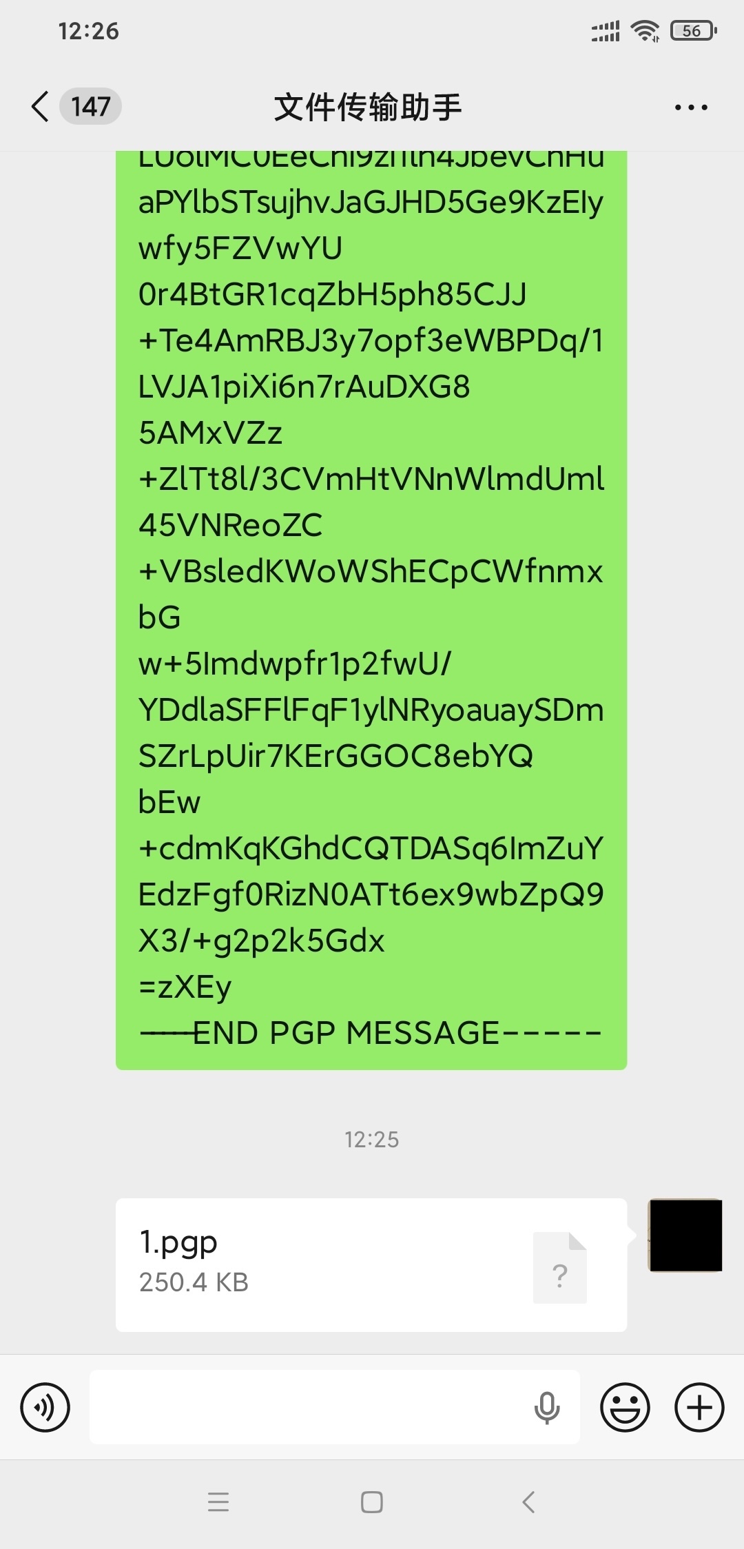 通信双方分别创建密钥后,需要交换公钥,才能实现点到点加密。 点击上面的分享图标,可以通过微信、邮件等发送给好友,如下图,会发送一个asc扩展名的文件