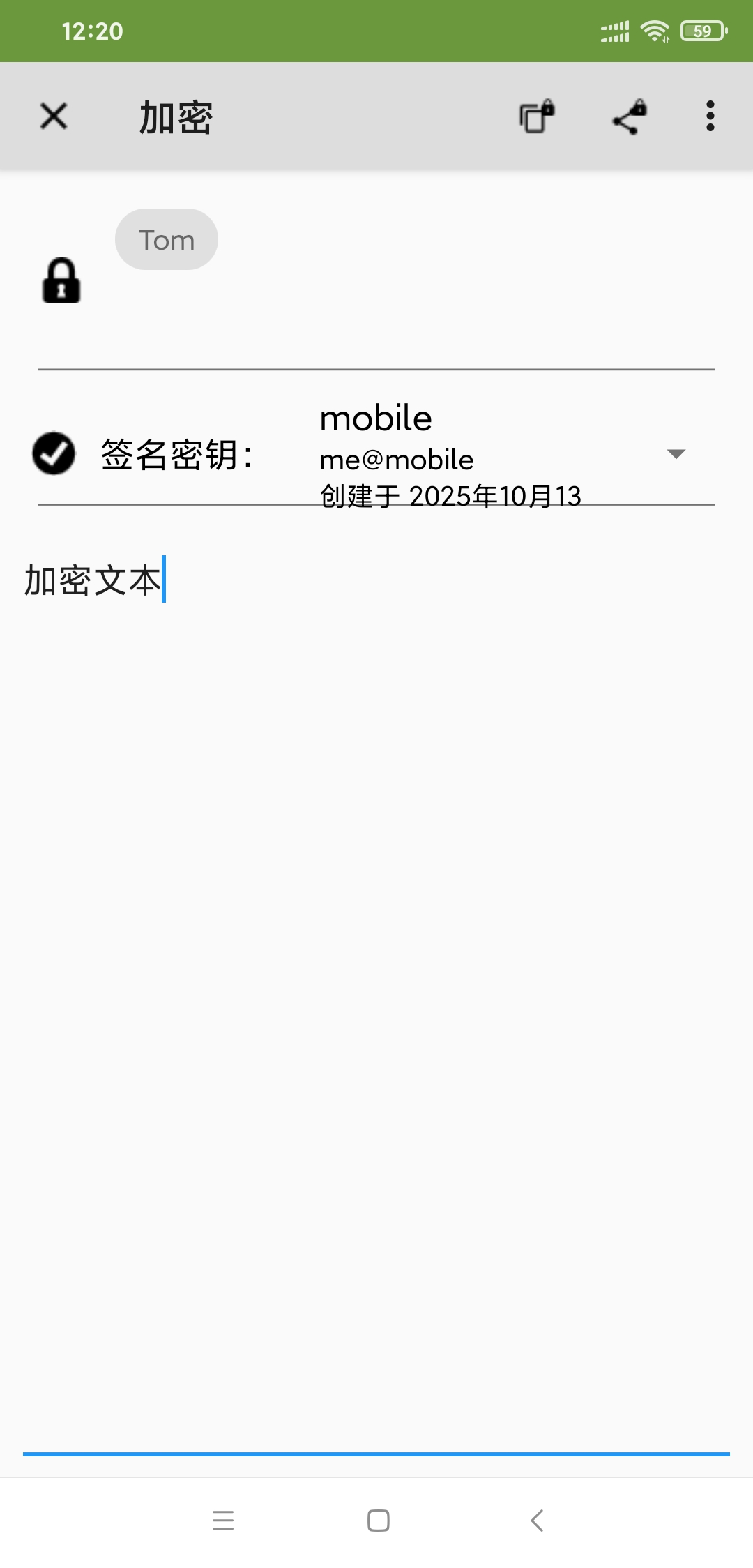 点击加密文字,在第一行的加密到,填写好友的公钥名称,会有选择提示,我们选择上面刚刚创建的Tom(为了演示选择自创建的Tom),实际应该是导入的好友的公钥,