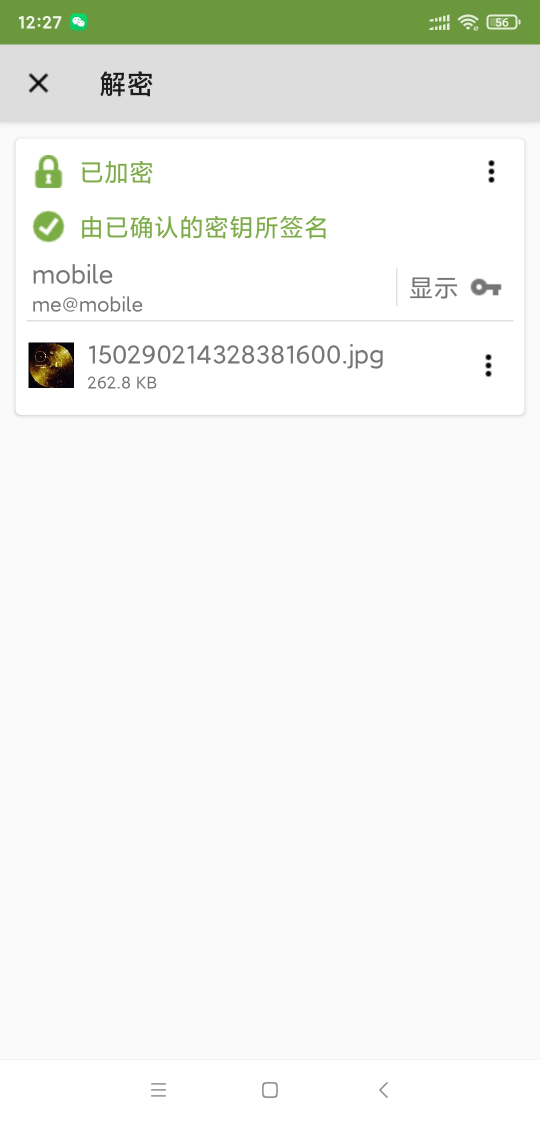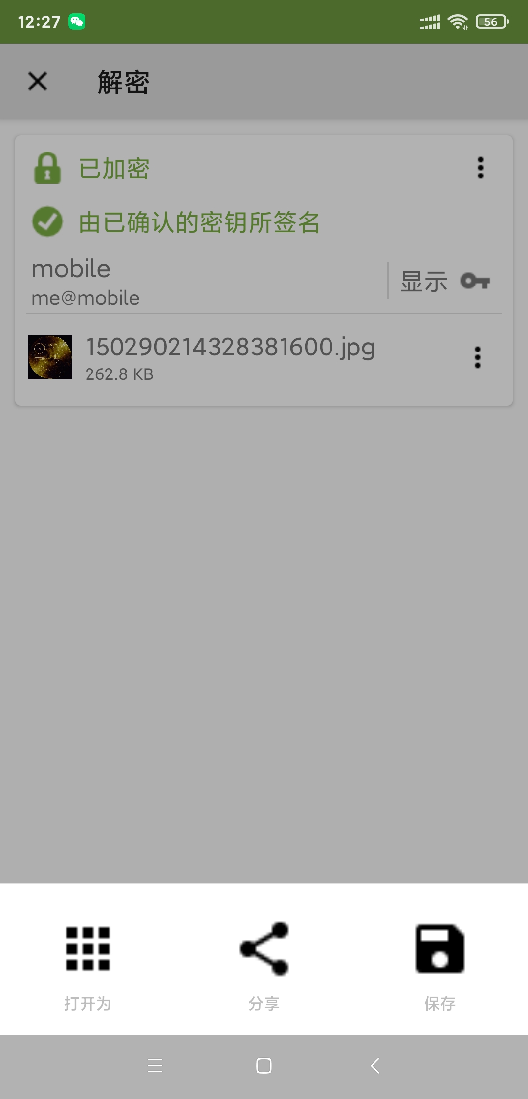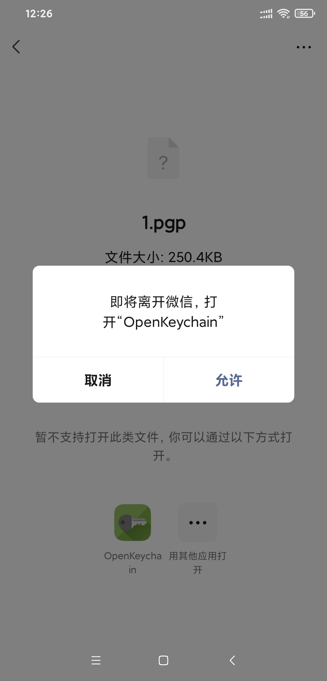 好友收到公钥文件后,例如在微信中点击asc文件,在弹出的打开方式中选择“导入密钥”